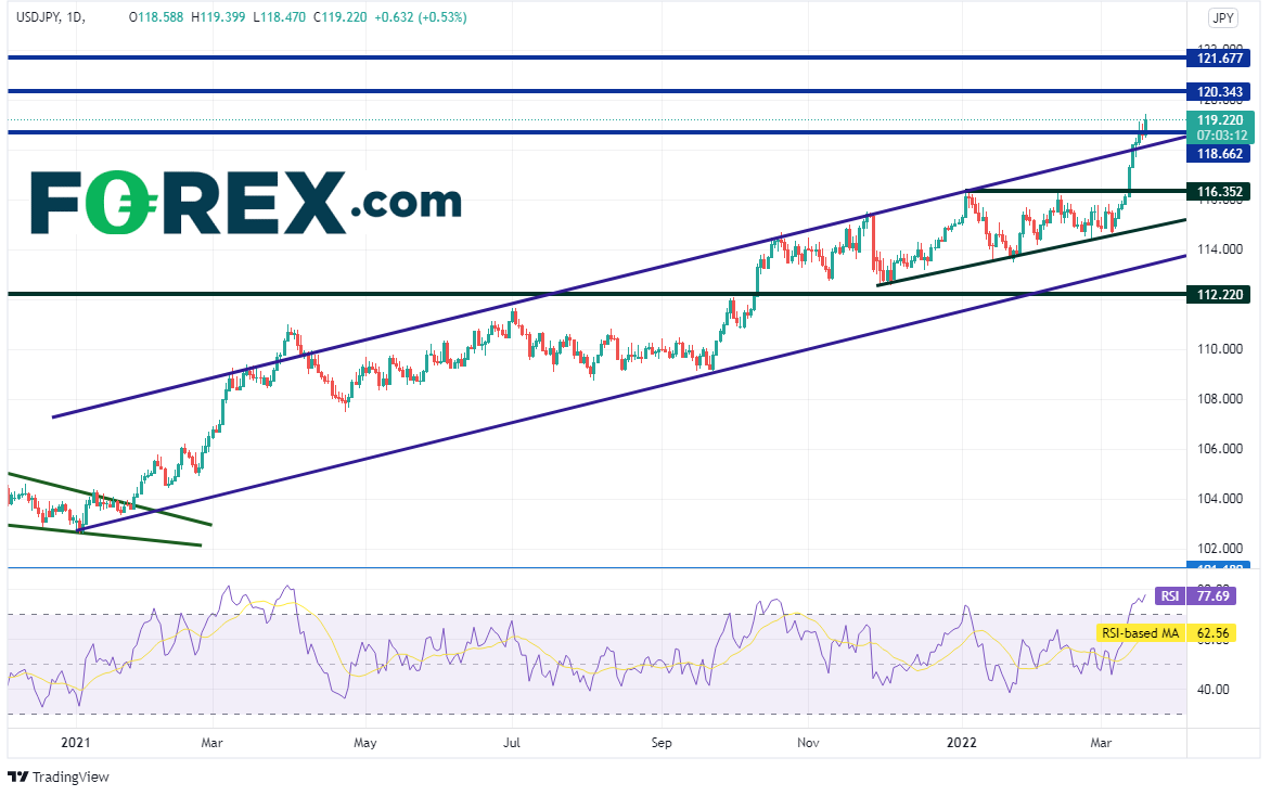 在日本央行立场温和且4月通胀率可能仅达到2%的作用下,美元/日元走高。不要忘了,美国预计通胀率在8%附近且处于加息模式。不过,如果俄罗斯/乌克兰战争再次恶化,日元重新扮演避险角色的可能性总是存在。另外请注意,RSI目前暗示价格短线可能回撤。