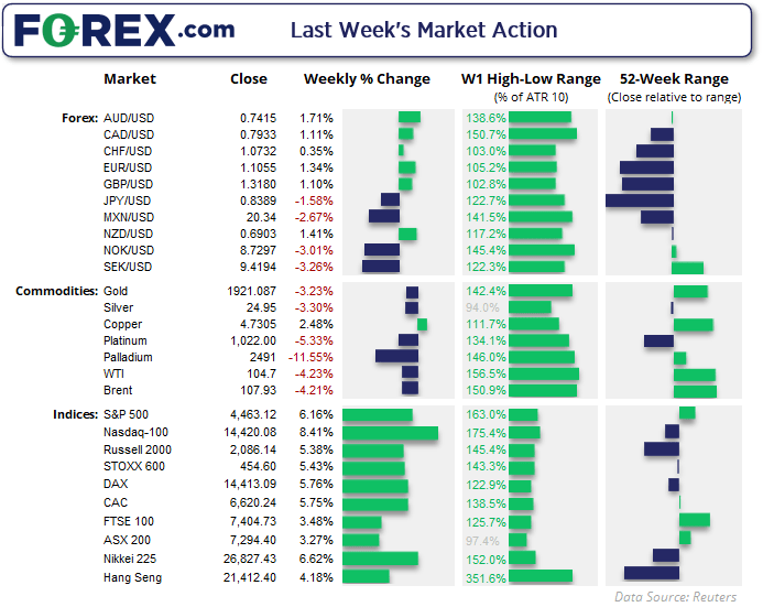 美股上周连续反弹四天,周五更是强力收尾。标普500指数斩获2020年11月以来最大单周涨幅,周图形成看涨吞噬K线。但上周表现最好的还是纳斯达克100指数,其上涨8.4%并创下4周高点。周五也是12月以来成交最活跃的一天,这增强了我们的看涨信心。我们在周四的视频中详细分析了成交量指标,并给出看涨观点。纳斯达克100指数收盘略高于其50天指数移动均线,而且200天均线在14688,不到一天的平均真实波幅。
