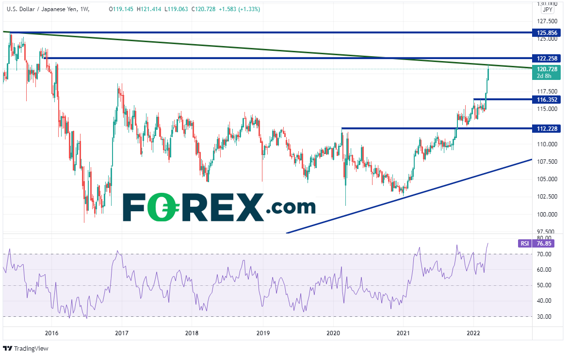日本央行的货币政策与美联储及英国央行的货币政策相背离,推动美元/日元和英镑/日元近期大涨。但两者在较大时间周期内都遭遇重大阻力位,而美元/日元的RSI超买。两者后市会上涨吗?可能止步于阻力位,但如果月图可以攻克阻力,则有望打开上行空间。