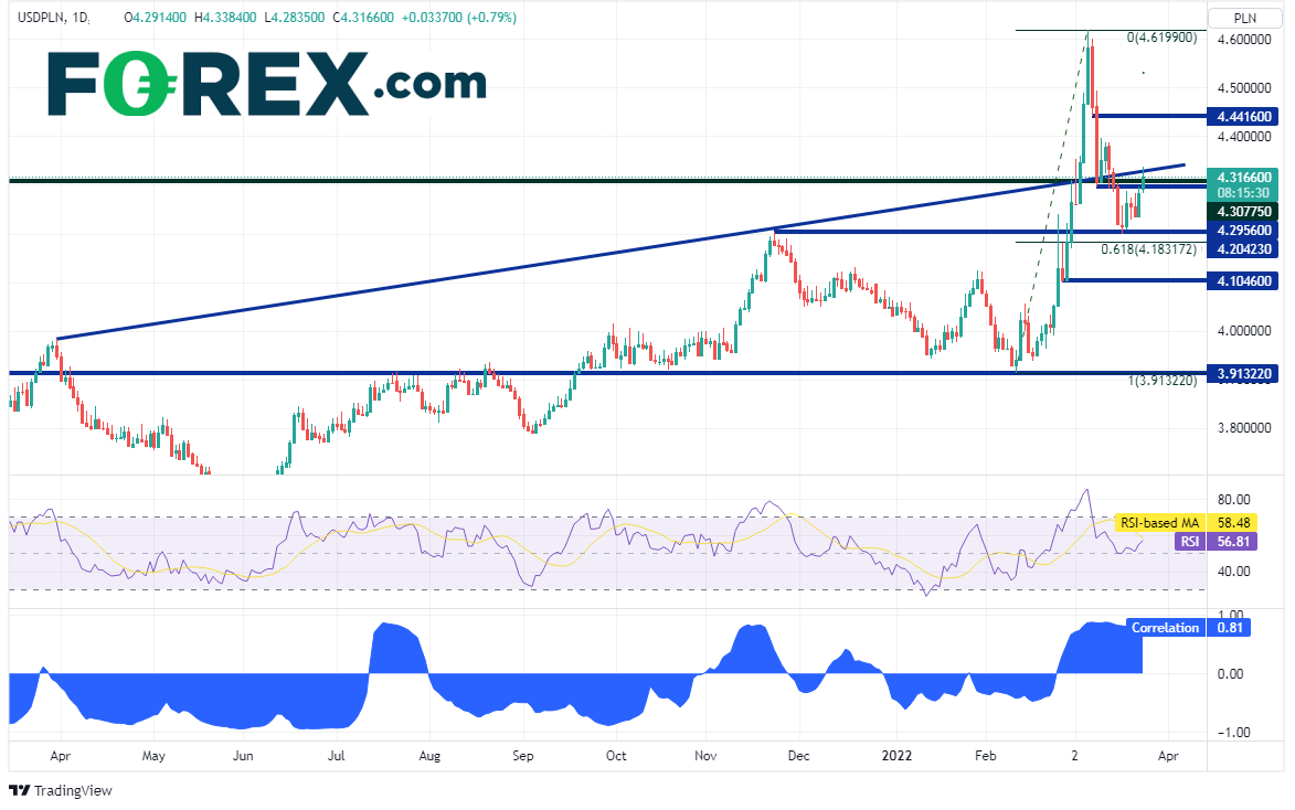 美元/波兰兹罗提和黄金之间存在高度正相关联系,目前两者的相关系数报在+0.81。高于+0.80的读数都被视为高相关性。美元/波兰兹罗提在俄罗斯入侵乌克兰后和黄金一样开始大举走高,于3月2日站上4.3078的前历史高点后攻城略地,在3月7日创下历史新高4.6199。该货币对此后回落至水平支撑位4.2042并且再度上扬。