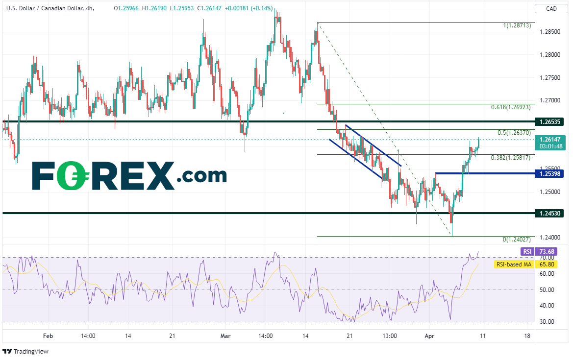 美元/加元自2021年11月中旬以来一直交投于1.2450-1.2900(请看绿色线)区间,于12月中旬尝试击穿该横盘通道的上轨,最近则在上上周试图下破通道下轨,但均以失败告终。价格在4月5日形成锤子形态后不断走高,目前交投于水平阻力位、2021年6月1日以来上斜趋势线与200天均线附近,即1.2620一线。