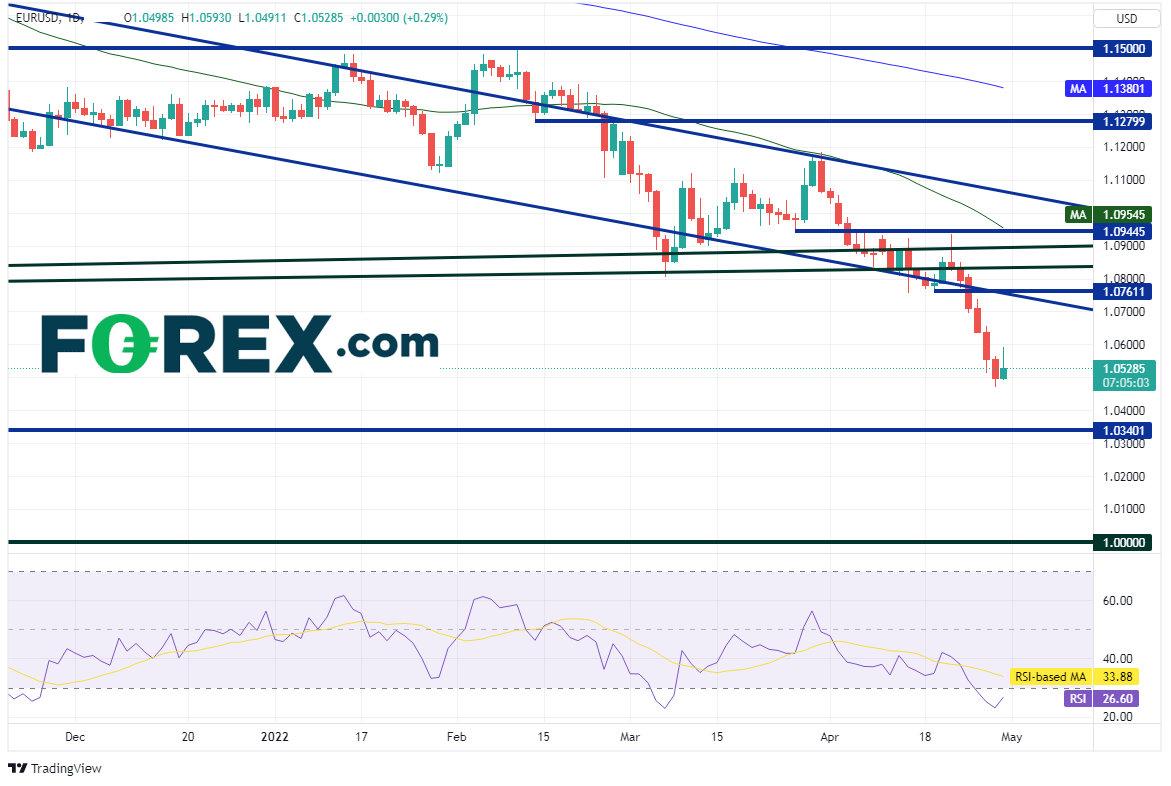 欧元/美元2021年5月以来有序下跌并形成下降通道,但在4月21日形成射日之星K线形态,这是由单根K线组成的看跌形态,即价格开盘后走高但之后遭遇抛盘,收在开盘价附近。欧元/美元在之后的5个交易日内自1.0770下跌至1.0470,形成短线低点。下方无支撑直至2017年1月以来低点1.0340,如果失守,或暴跌至1.000心理整数关口。但请注意RSI处于超卖状态并已调头向上,表明价格或准备回升。