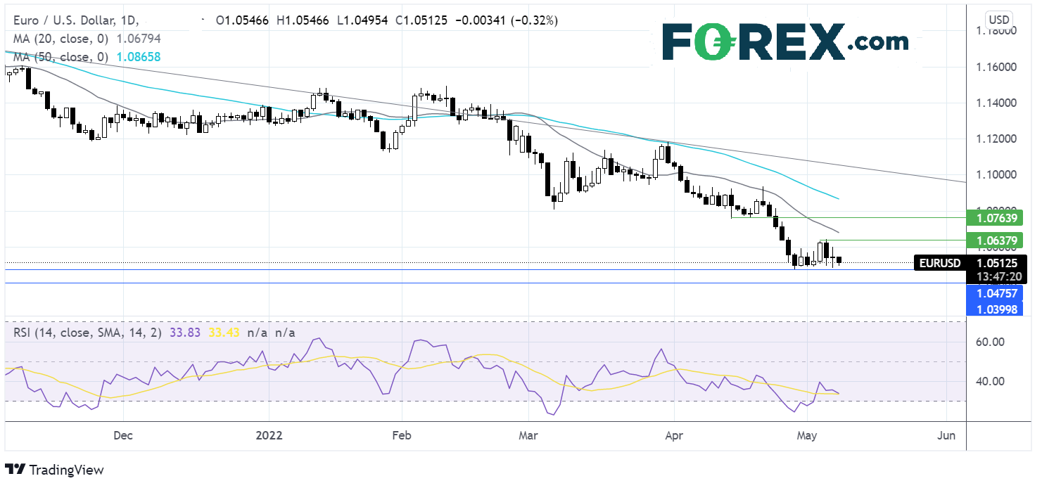 欧元/美元正挑战1.05。要想延续下跌趋势并下看1.04整数关口与2017年1月低点1.0360,空头需要下破1.05与2022年低点1.0470。