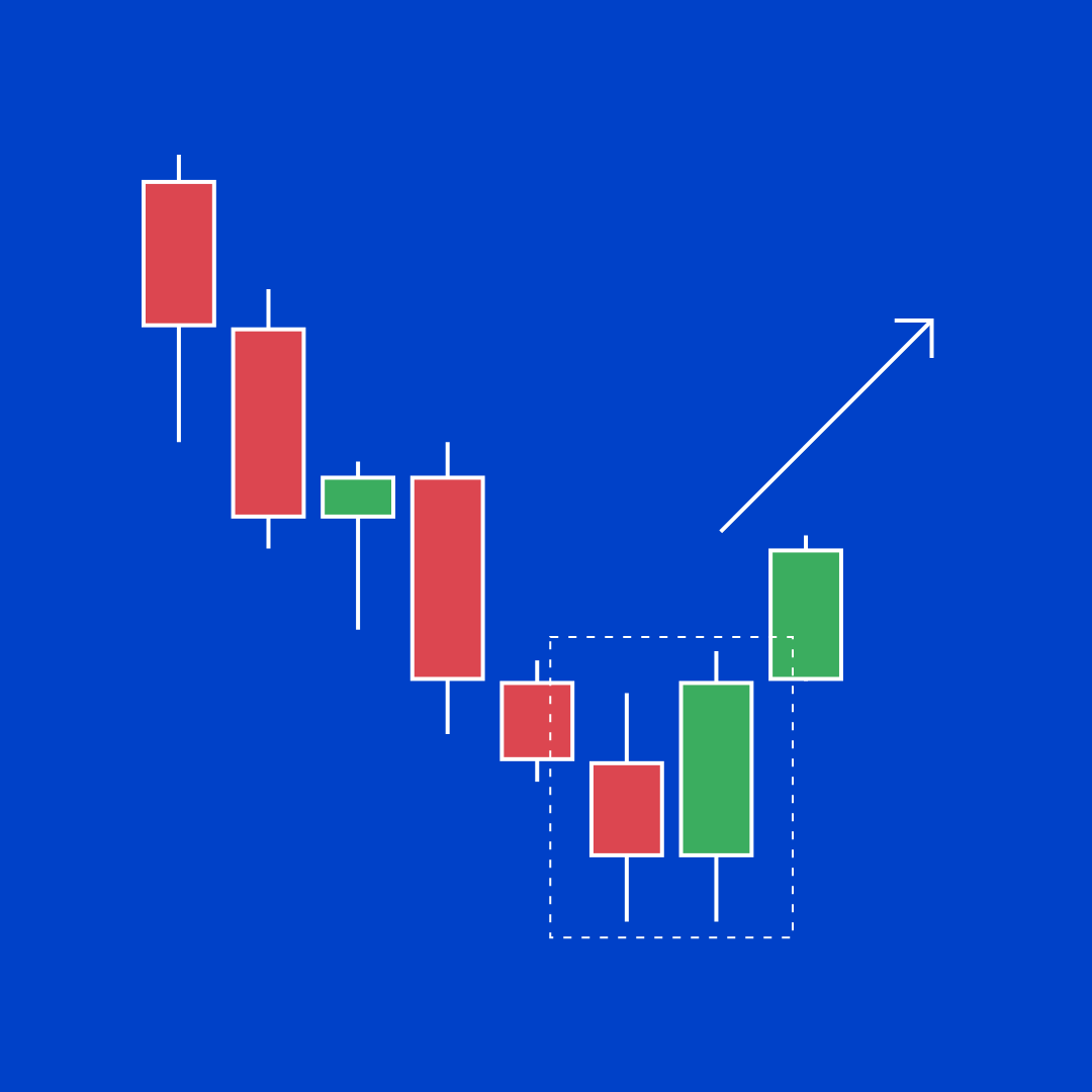 - 三根实体较小的阳线,悉数落于第一根蜡烛的范围内