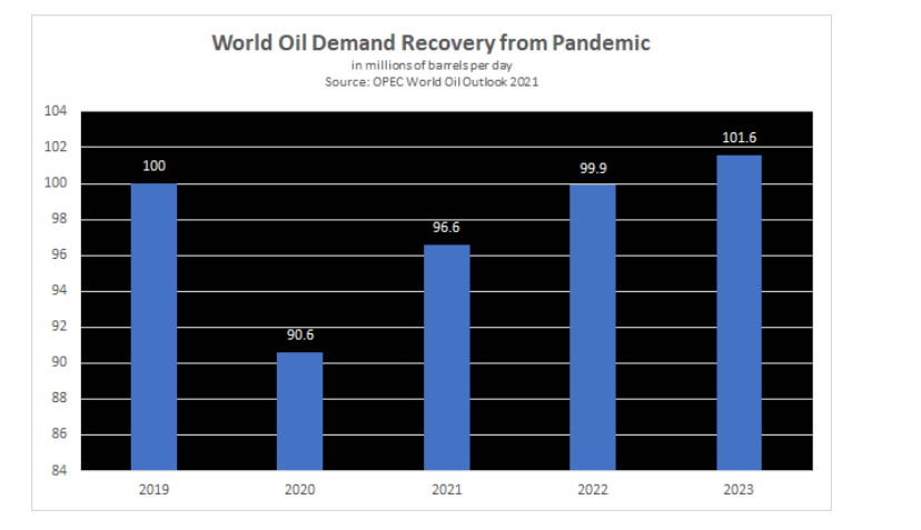 油价的上涨促使美国部分生产商增产,预计美国明年的供应占非OPEC增量供应的60%,但要达到疫情前的水平,可能要到2022年年末。