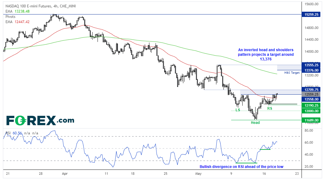 4小时图可能在构筑头肩底反转形态,测量目标在13,376附近,但200期指数移动均线附近的13,200也是重要目标。价格曾小小地尝试突破12,558附近的颈线,但亚洲市场未能实现。所以,看到站上12,710,我们才有信心相信价格已突破。