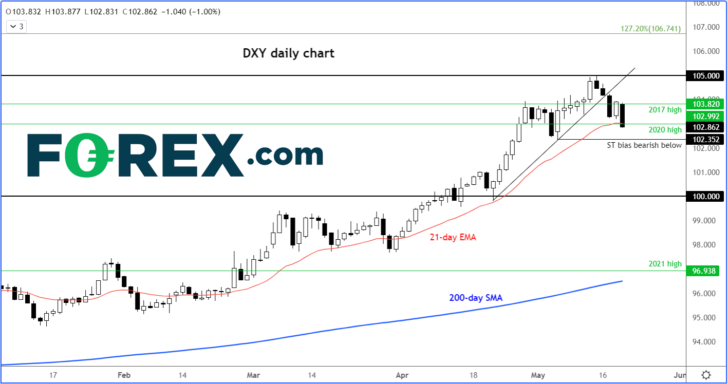 而美元可能扩大下行。美元指数如果突破102.35,可望确认低点下降,也表明无力持续守住2020年高点,从而被视为假突破反转形态,是重要的一步。短线趋势线告破,美元指数技术面或已遭遇首个重创。不过是否已筑顶,则尚需观察。
