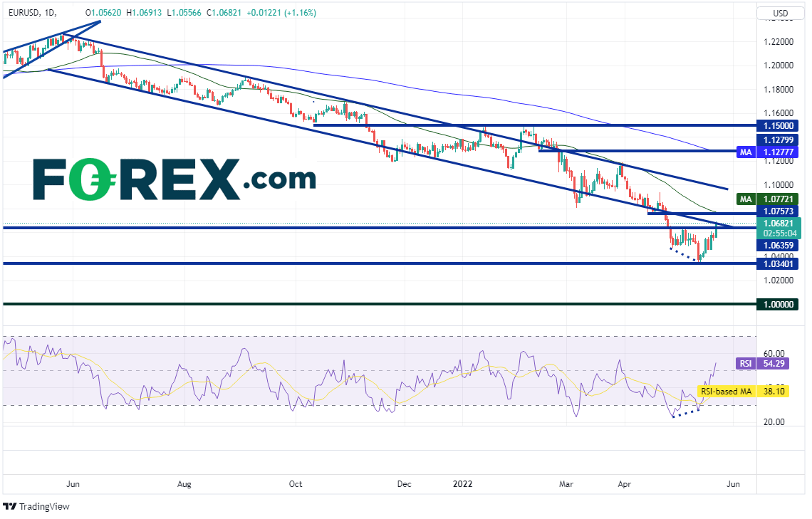 在拉加德奠定欧洲央行接下来加息基础的助力下,欧元/美元延续近期涨势。叠加好于预期的德国Ifo报告,欧元/美元当天反弹逾100点子。该货币对后市可以守住反弹之势吗?如果价格可以击穿1.0700并且4小时图RSI回落至中性区域,则存在这样的机会。