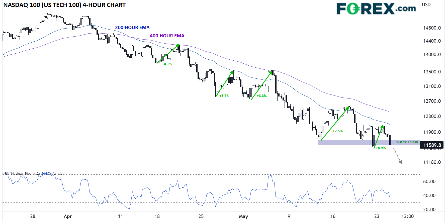 过去6周里,该股指400小时指数移动均线(4小时图上的100期指数移动均线)始终压制了这次反弹。此文发稿时,纳斯达克100指数再度面临下破至新低的风险,空头下看上周低点11,500区域。如果攻克,下方没有重要支撑位,直至2020年11月低点11,000附近。