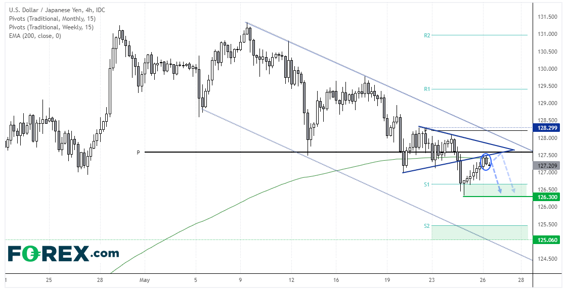 正如我们昨天讨论过的,货币对逆势反弹并攻向月线图枢纽。我们现正密切关注汇价下行潜力。阻力位在200和20均线附近及下行三角下方趋势线。4小时图也构筑看跌内包线。我们在月线图枢纽(黑线)下方看跌,目标包括周线图一号支撑枢纽及126.30三角目标。