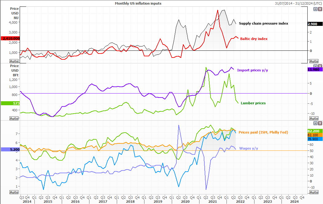 ISM与费城联储报告显示,4月服务业与制造业公司的“物价支付”指标同样下跌。进口价格(即进口产品的通胀率)与薪资年化后同样下降,而且木材价格已自今年高点暴跌。也有信号显示,瓶颈正在疏通。供应链压力指数3月下降,相比12月峰值低了不少。波罗的海干散货指数,即衡量海运成本的指标,同样调头向下。本周初,美国零售商Target警告,将不得不降价以消化低需求下庞大的库存。