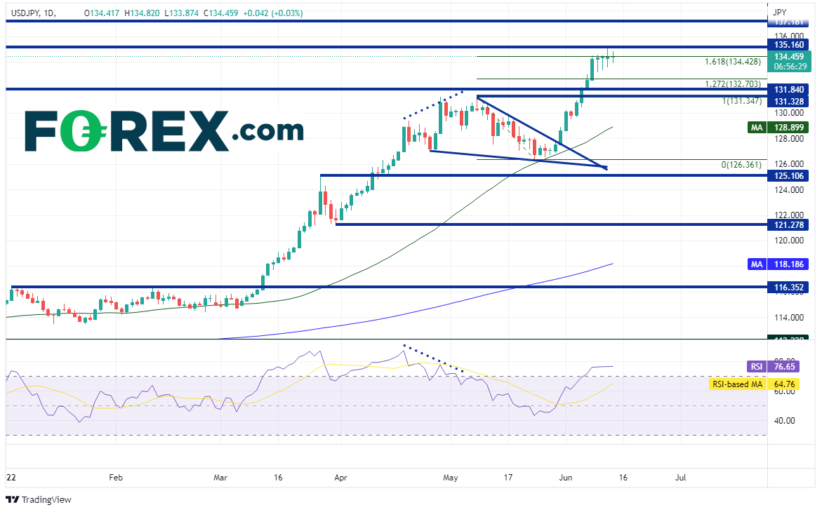 美元/日元6月初以来一直着意攻克135.00,昨天最高到达135.19。价格自3月初调头向上以来始终处于上涨趋势中,在5月9日创下短线高点130.81。之后回撤,形成下降楔形并守住126.31附近的50天均线。5月末,该货币对打破下降楔形,昨天延续涨势,摸至135.19,途中夺取了多个斐波纳契位和水平阻力位,目前交投于1998年以来最高点附近。