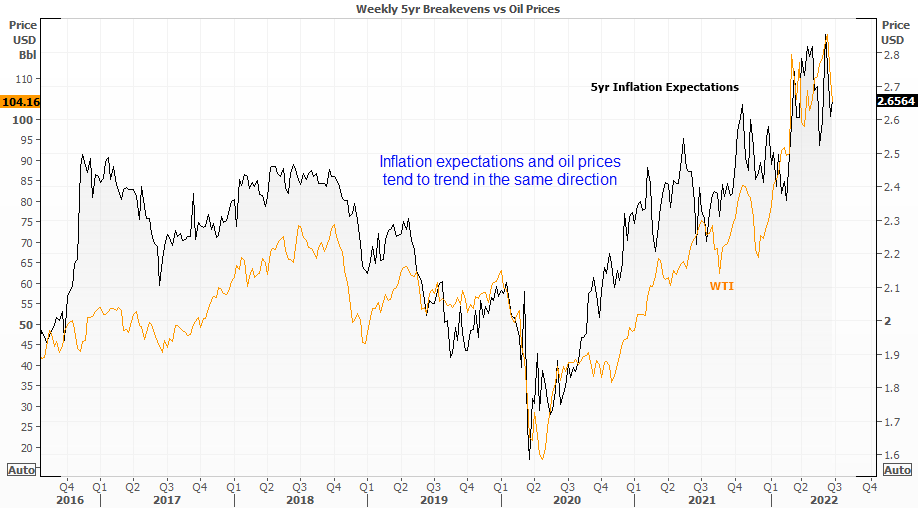 虽然美联储仍打算以软着陆为目标,但面临的挑战十分艰巨。国际货币基金组织和世界银行再次下调全球GDP预测,这也暗示石油需求将走低。而且,经济衰退的说法可能会削弱民众信心,从而拖累消费,通胀预期和实际通胀随之走低。再进一步,消费者和企业信心所承受的压力或得到舒缓,同时央行收紧货币政策的必要性减弱,从而或于不经意间成为风险资产看涨信号。这可能会带来一个需要时间来慢慢铺展开来的做多机会(如果存在),不管怎样,该可能性还是值得我们关注。