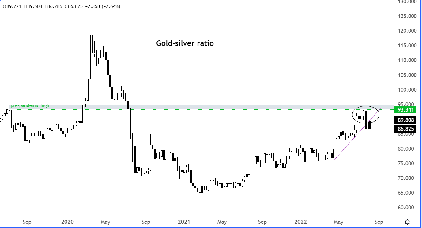 快速浏览金银比率周图就会发现,白银的表现已经好于黄金。该比率在数周前触及93.35附近的重要阻力后下破趋势线,如果继续下跌,可能在相对基础上利多白银。
