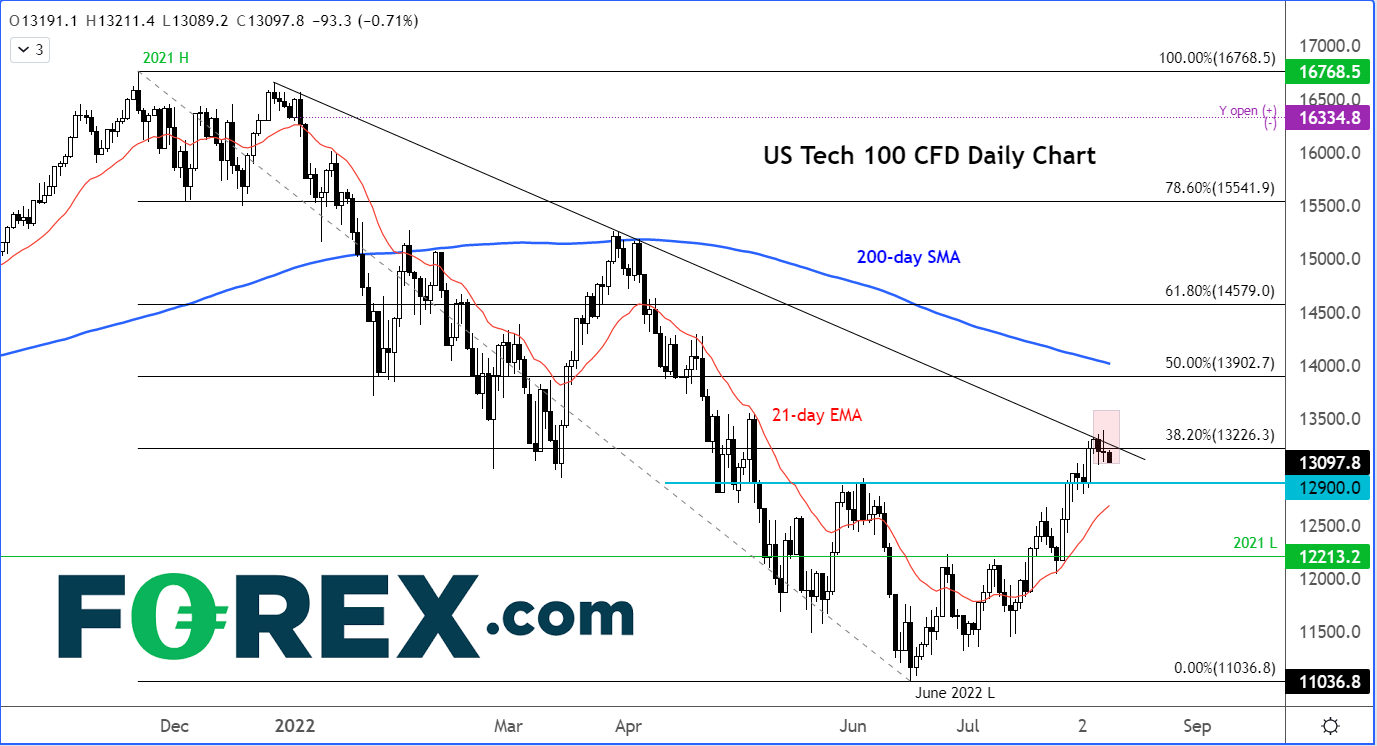 当然,现在还不到下结论的时候,只是如果现在仍处于熊市,我们不应忽略这些信号,以免陷于危险当中。纳斯达克100指数早些时候站上其下降趋势线,但未能守于其上,随之调头向下。另外,38.2%回档位也构成看跌技术因素。