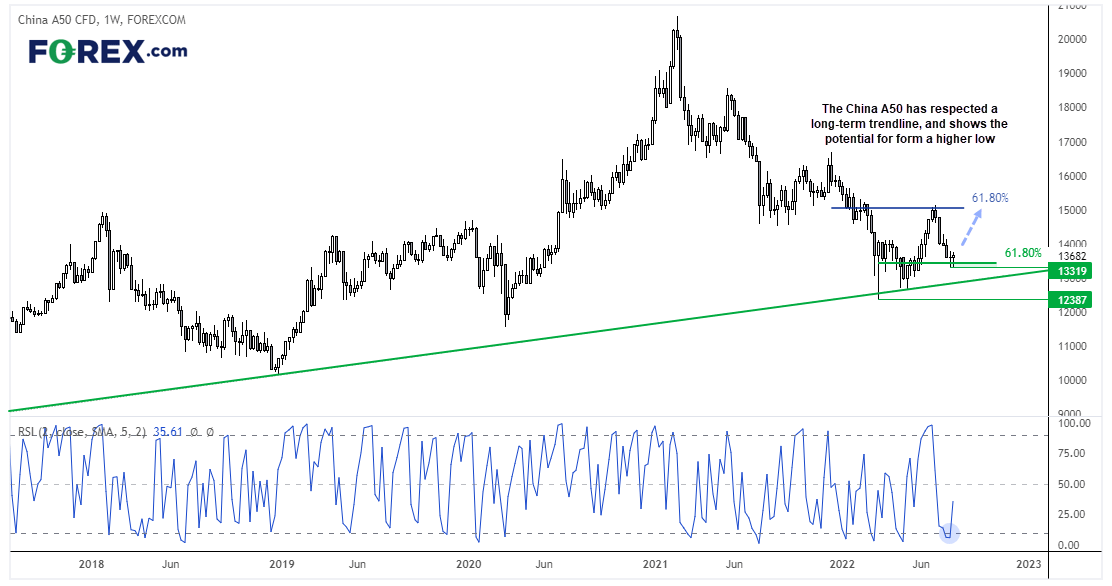 我们在上篇文章中强调了中国A50指数守住了长期趋势线,始于2021年一季度的熊市可能趋于尾声,并且得到了周图长阳锤子形态、低点上抬与强劲反弹事实的增援。