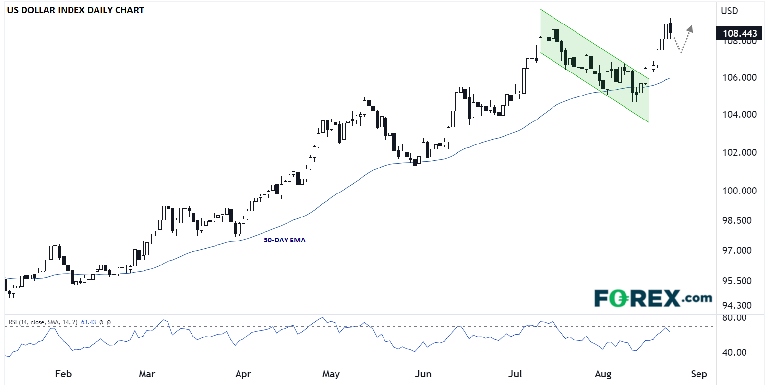 我们来看美元指数。今年美元一直处于上涨趋势中(事实上这个时间点可以提前到2021年年初)。美元测试了109.00上方不远处的20年高点,此文发稿时在回撤。但如果鲍威尔周五的讲话和预期地一样强硬,交易者可能迅速回归看涨阵营。