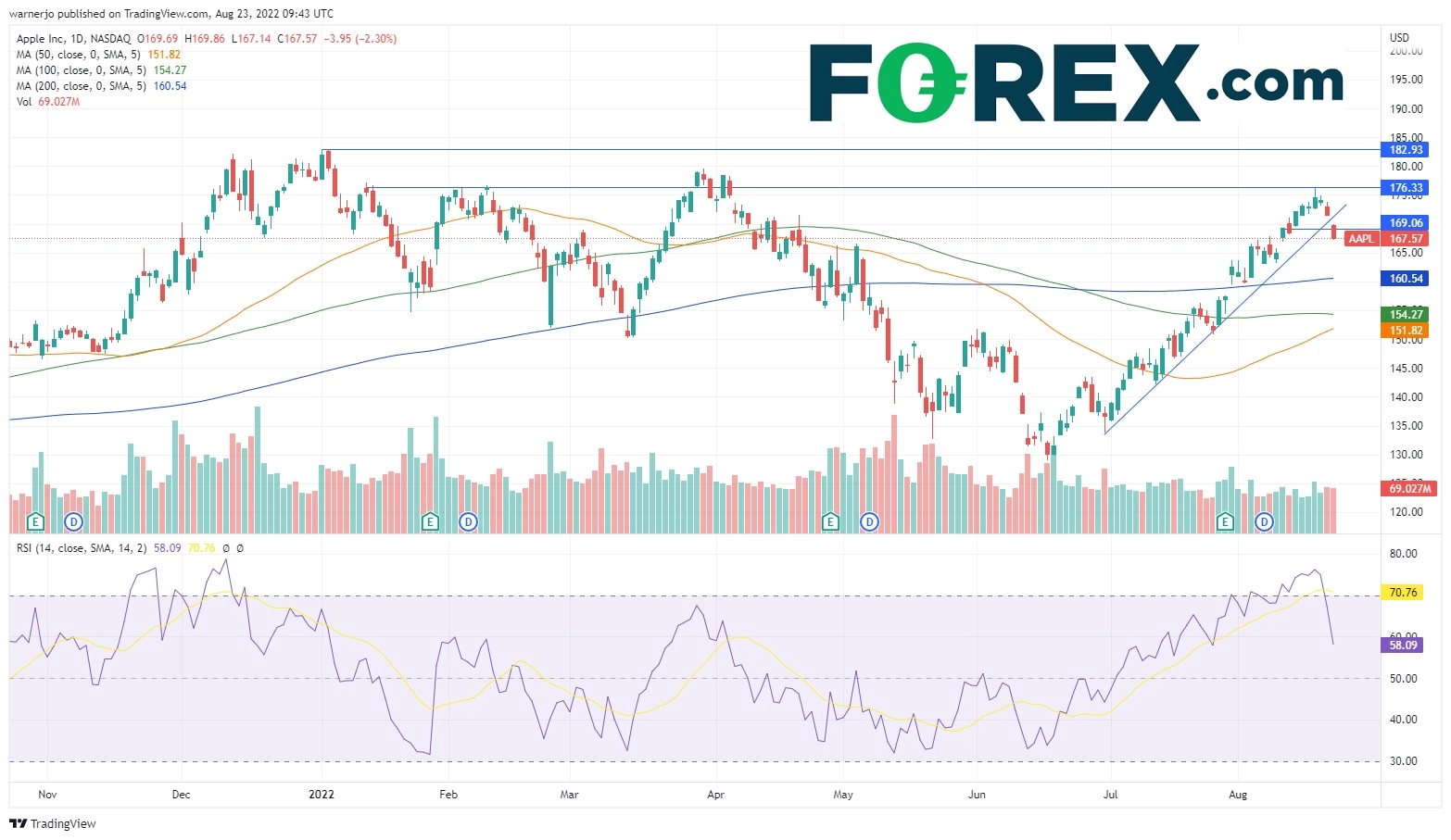 如果上文提到的压力挥之不去,苹果公司的股价可能回落并下探200天均线所在的160.50,那是7月底跳空高开的位置。如果继续下探并填补缺口,则可能下看100天均线154。如果攻克,可能进一步下看50天均线兼6月高点151.80。