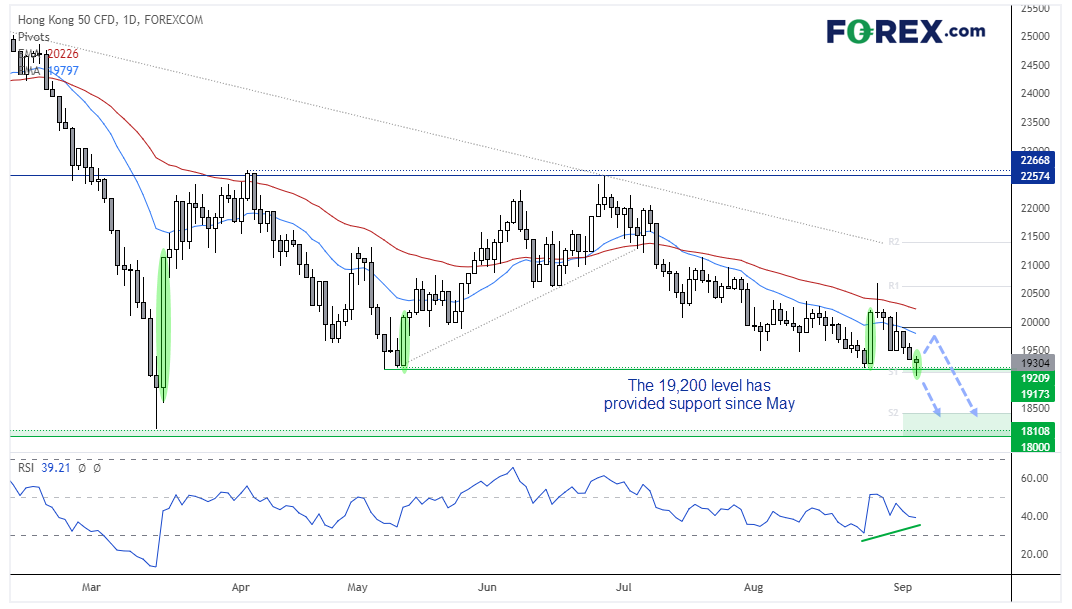 恒指日图处于下跌趋势,但在8月25日形成看涨吞噬大阳线,表明19,200一线筑有强买需。恒指5月曾形成相似的K线,并且自那以后一直守住19,200一线。股指在8月25日之后走出了看跌pinbar且随后跌破20,000,但从用了6天时间才将看涨吞噬K线斩获的涨幅回吐殆尽这一事实判断,上涨的力量不容小视。