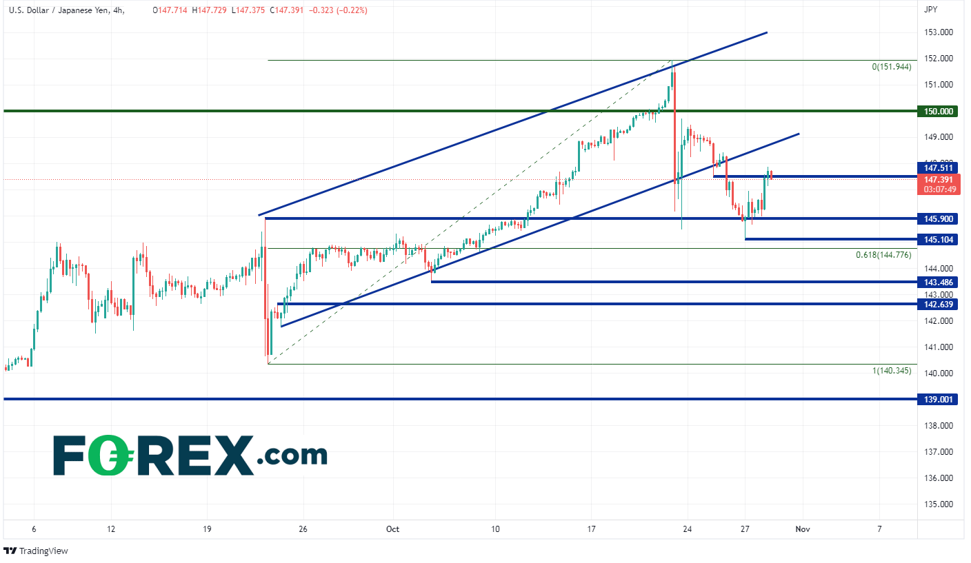从4小时图来看,美元/日元对利率预期动态最为敏感,受此前日本银行会议鸽派立场影响,上周五市场整体买入货币对。如果市场认为11月和12月加息75个基点大势已定,美元/日元可能进一步上升。在4小时图上,货币对在水平阻力位附近的147.51徘徊,继续上行,下一阻力位则位于上行通道上轨148.75附近。继续向上,价格将上探心理整数阻力位150.00,最后达到10月21日高点151.95。如果货币对下行,则第一个支撑位将落在9月22日高点145.10和10月27日低点145.90形成的区间。继续向下,价格可能跌至9月22日低点到10月21日高点的61.8%回档144.78,下一个支撑位落在10月4日低点143.49。