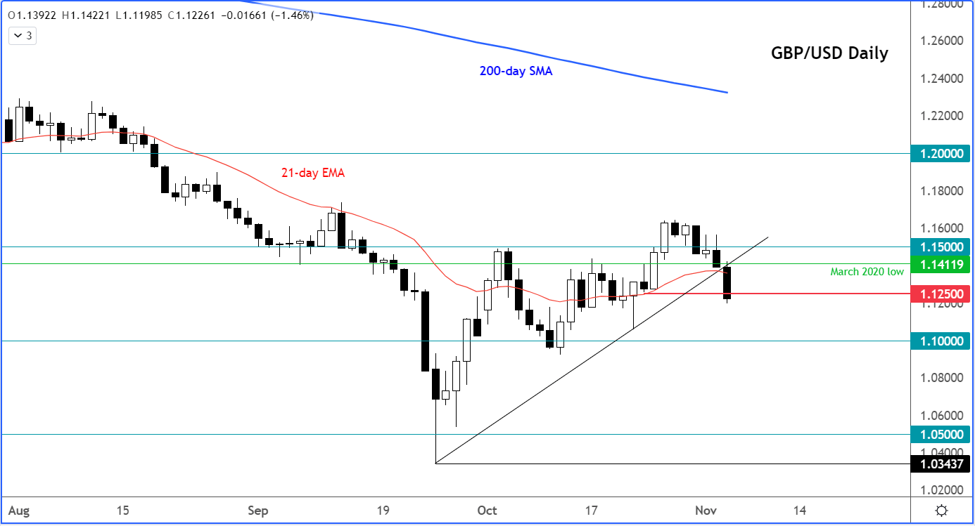 但鉴于英国央行的鸽派言论和美联储的鹰派信息,我们有可能看到英镑/美元开始走向1.10关口,甚至可能更低。随着短期看涨趋势线和支撑位1.1250被打破,从技术角度上看,目前阻力最小的方向肯定不会是上行。