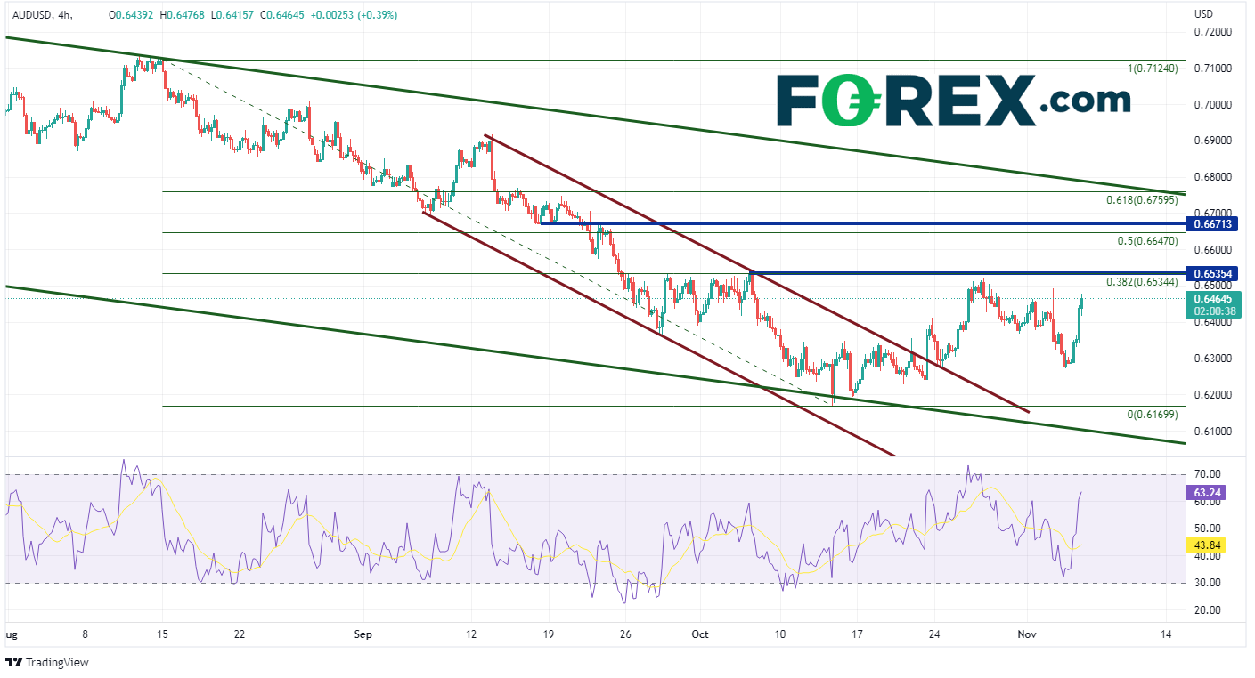 在更短的240分钟图内,澳元/美元最近冲出了短期下行通道,可能开始扭转势头。澳元/美元正在接近复合阻力区间0.6529至0.6540,即10月22日的高点、从8月15日高点到10月13日低点区间的38.2%斐波那契回撤位以及50日移动平均线(见日线图)。如果价格突破该区间,下一个阻力位是前述同一区间的50%回撤位0.6647,然后是水平阻力位0.6671。但如果该货币对走低,则第一个支撑位在11月3日低点0.6272,然后是10月13日低点0.6170。在此之下,则是长期通道的底部趋势线0.6100附近。