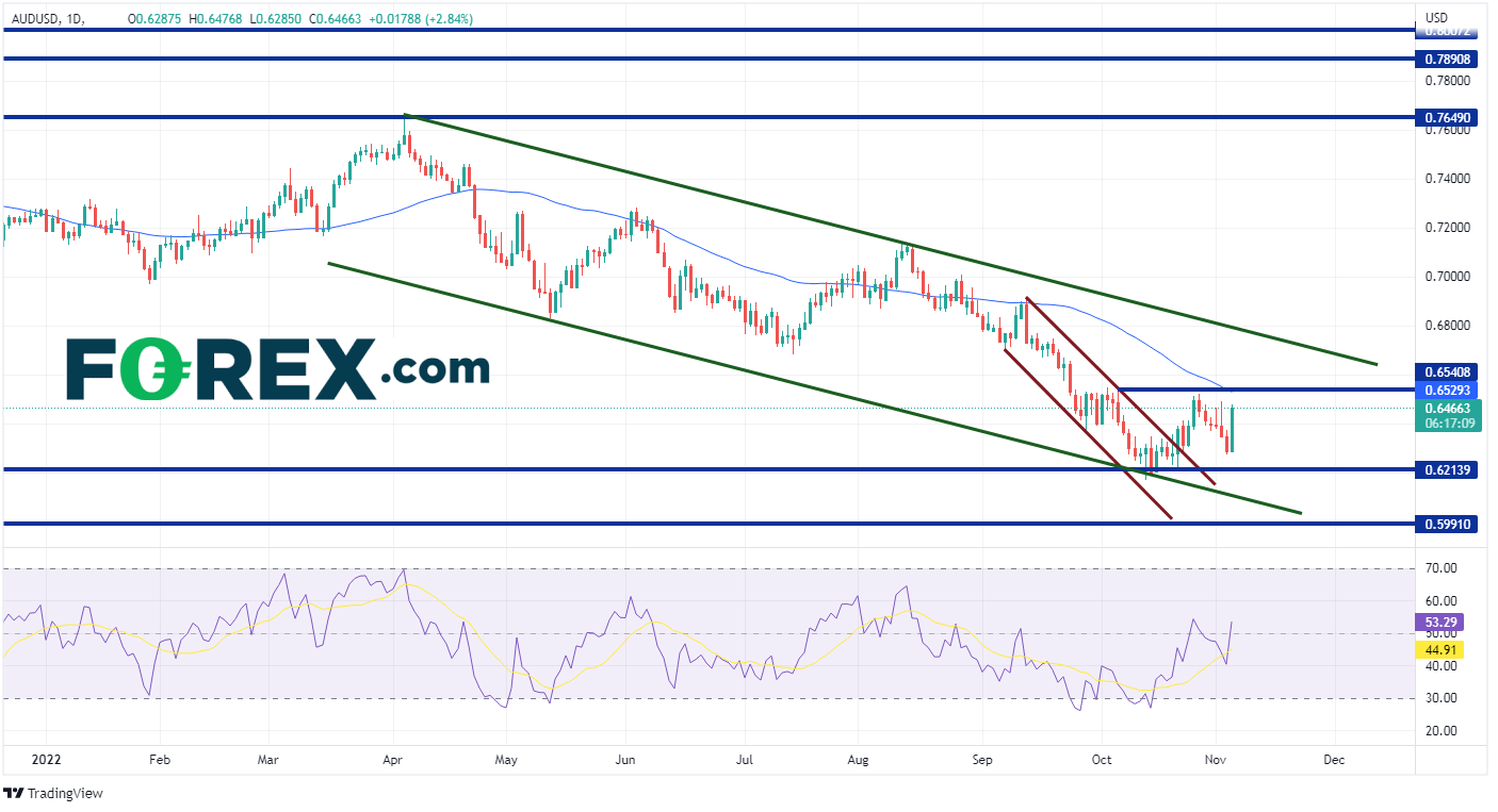 由于就业数据强于预期,美联储可以继续在“物价稳定”方面放开手脚干,可采用的手段包括在12月的会议上仅加息50个基点。结合中国可能正在放松新冠管控的消息,澳元/美元处于看涨态势。关注下周的CPI数据,这有助于判断美联储是否会在12月会议上加息50个基点或75个基点!