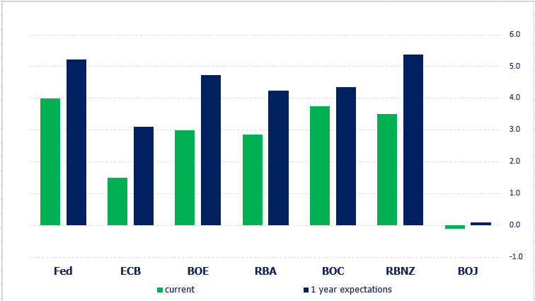 全球央行在以前所未有的速度加息来遏制高企的通胀率,一些国家甚至面临四十年来最高通胀水平。但是什么时候能够停止加息,利率的最终目标水平是多少,这些问题仍没有答案。下表展示进行加息操作的主要央行,以及市场对未来一年汇率走势的预测。这些利率全部高于两年隐含政策利率,这意味着市场预期央行利率将在一年后升至峰值,随后开始降息。
