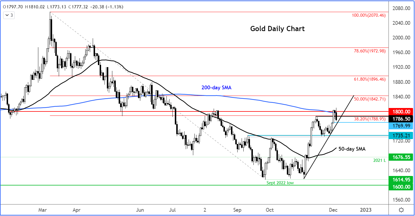 多头若未能夺回200天移动平均线,对空头而言无疑是振奋人心的好消息。但空头并非就此安枕无忧,如果想要重新拿回价格控制权,还有几个重要支撑位需要打破。其中1770美元是第一道坎,看涨趋势线将在此汇合。向下第二个支撑位落在最近低点1735美元。