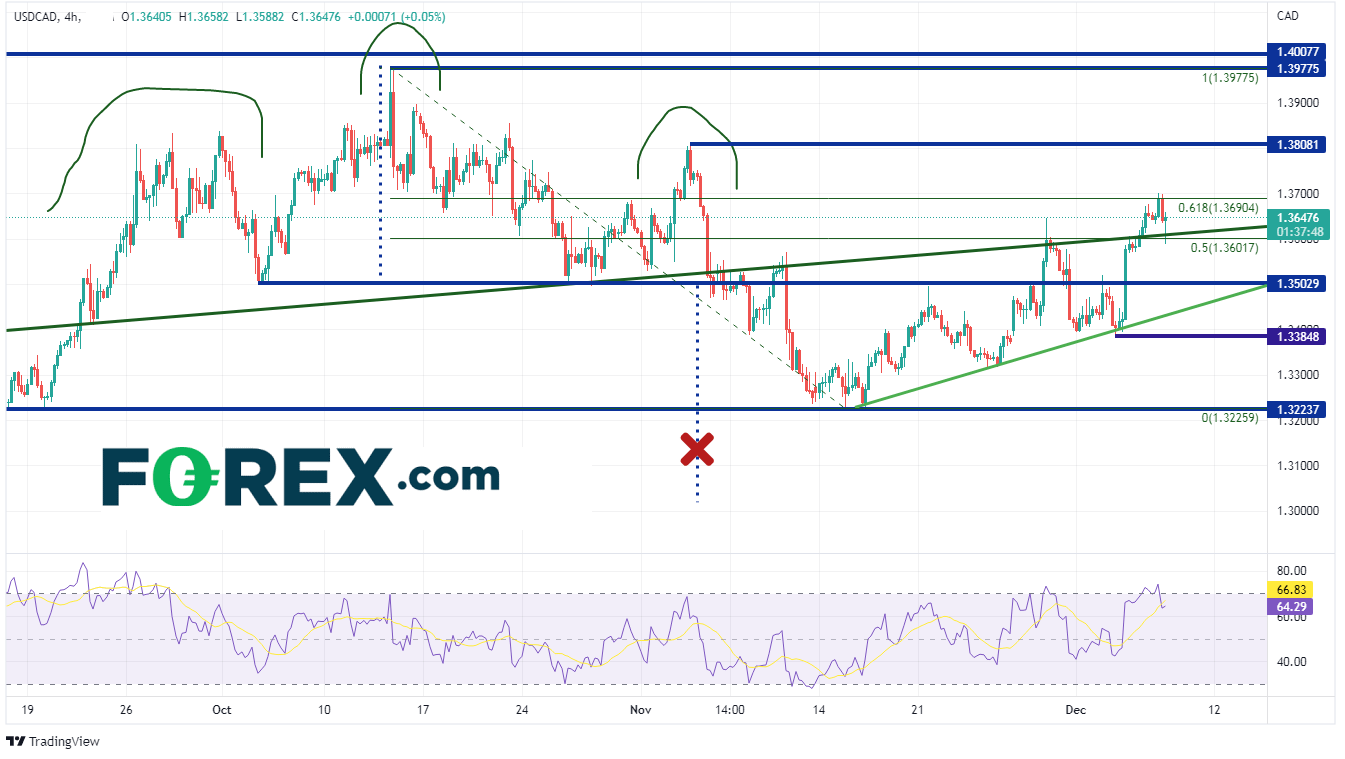 在240分钟图上,美元/加元交投于10月13日高点至11月15日低点的61.8%斐波那契回撤位1.3690附近。它看上去正在走低,回到上升楔形。如果周二的走势最终被证明是假突破,则第一个支撑位在头肩形的前一个颈线1.3503附近。下方支撑位于上升楔形底部上升趋势线1.3435附近,然后是12月5日低点1.3374。然而,如果美元/加元止跌反弹,那么今天高点上方的第一个阻力位是水平阻力位1.3808,然后是10月13日以来的高点1.3978。
