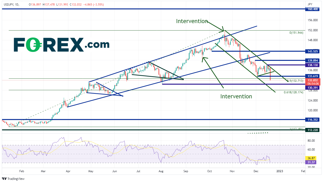 这是美元/日元今年经历的第二大跌幅,仅次于11月10日美国CPI低于预期导致的美元大跌。今日货币对突破上升通道,上方阻力位分别位于12月5日135.25附近、12月5日低点133.61附近,及年内低点与高点之间50%回档位132.71。请注意,日内货币对价格测试长期下行通道的上轨后,再度下探。不过整体而言,美元/日元在通道中稳定运行。下方支撑位分别落在8月2日的低点130.39和通道下轨128.75附近。由此向下,价格可能跌至上述时间框架内61.8%回档位128.17。