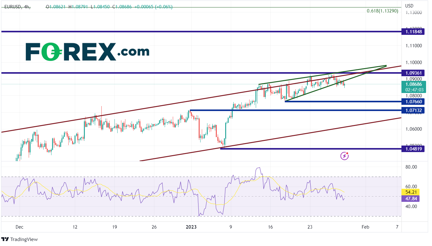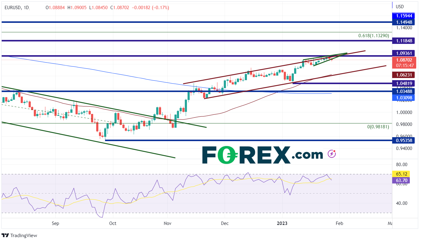 由于数据全都在意料之中,美元在数据公布后几乎没有动作。正如我们在之前的文章中所讨论的,欧元/美元在2022年9月28日触底0.9536后,持续走高。11月中旬,该货币对开始在狭窄的上行通道内移动,保持在50日移动平均线和水平阻力位1.0350上方。该货币对目前在通道的顶部趋势线附近振荡,并形成上升楔形,因为欧元/美元遇到了2022年4月21日的高点1.0936附近的水平阻力位。