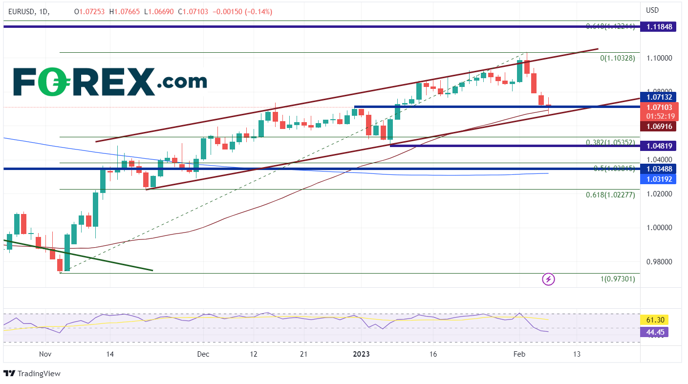 自2022年11月中旬以来,欧元/美元一直在通道中走高。价格在FOMC会议后于2月1日突破该通道顶部的上行趋势线。价格在2月2日触及高点1.1033,但在欧洲央行会议后反转。这使该货币对重新回到通道内,价格持续走低。今天,欧元/美元触及通道的底部趋势线和50日移动平均线后反弹,当日几乎收平。如果价格继续走低,通道趋势线下方的第一支撑位是2022年11月3日低点到2月2日高点区间的38.2%斐波那契回撤位1.0535。在此之下,价格可能会移动到1月6日低点1.0482,然后是上述区间的50%回撤位1.0380。但要是守住通道支撑位,则第一阻力位在通道顶部趋势线1.0995附近,然后是2月2日高点1.1033。如果价格突破该点位,下一阻力位将看向2022年3月31日高点1.1185。