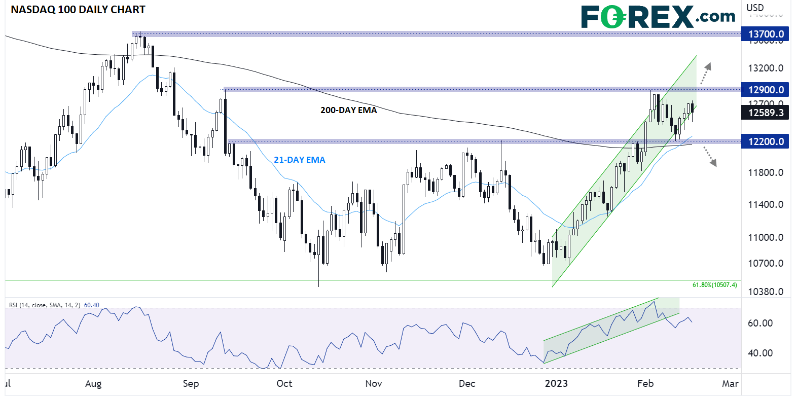 从图表上看,尽管14日RSI已经跌破上行通道,但价格仍勉强徘徊在年初至今的上行通道内。最需要关注的点位是之前的阻力位12,900,突破该点位将继续向13,700或12,200进发,如果本周确认跌破该通道,12,200理应是第一个下行目标位。