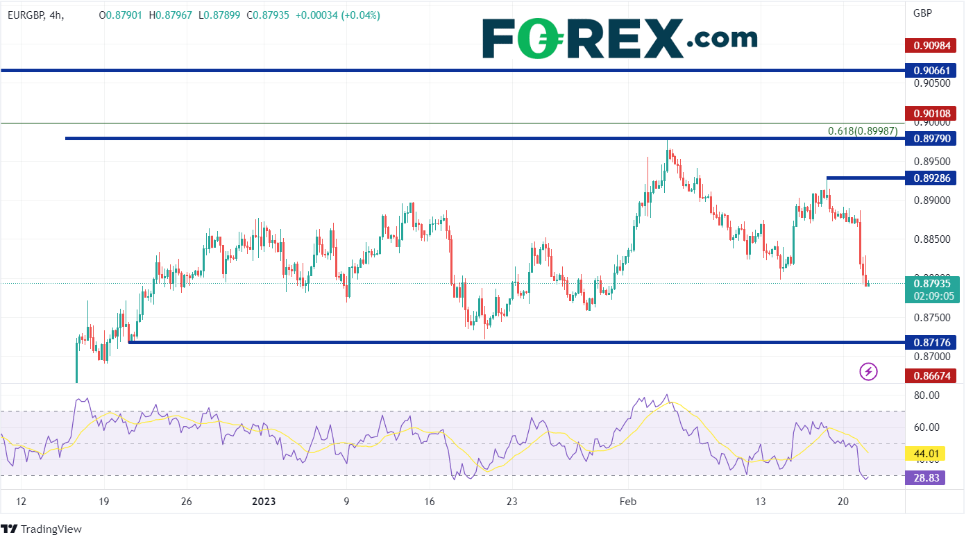 在240分钟图上,如果欧元/英镑继续走低,第一支撑位于2022年12月20日的低点0.8717。在此之下,价格可能会跌至200日移动平均线0.8652(见日线图),然后是2022年12月1日的低点0.8547。但是,请注意,240分钟图上的RSI处于超卖区域。这表明该货币对可能已经准备好反弹。如果欧元/英镑的确反弹,第一阻力位是2月17日以来的高点0.8929。接下来是复合阻力位,由2月3日以来的高点0.8979和上述61.8%斐波那契回撤位0.8999构成。在此之上,价格可能会升至2022年9月28日以来的高点0.9066。