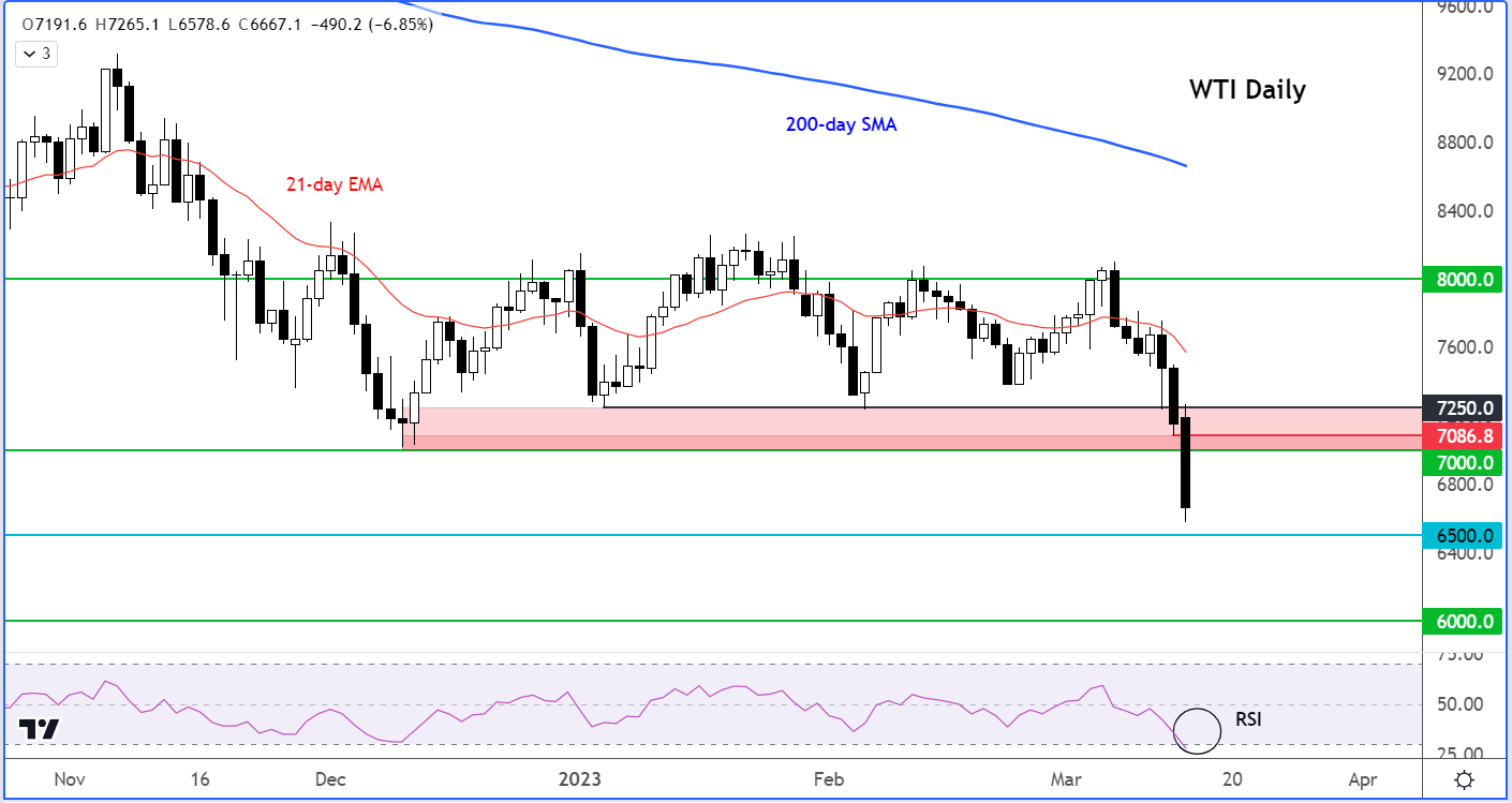 除非油价以某种方式实现修复,否则这将是近期最大的跌幅之一。WTI出现了6个月来的最大单日跌幅。本周,油价迄今已下跌约12%。不过这种抛售迟早会在某个时候到来,毕竟价格长期滞留在走廊内——确切地说是自12月初开始。事实上,我们现在有一个触发看跌的基本面因素——金融不稳定的风险急剧上升——将价格从区间内横盘转变为破位下行,这意味着技术交易员也会通过卖空石油期货来趁势得利,从而进一步对价格造成压力。