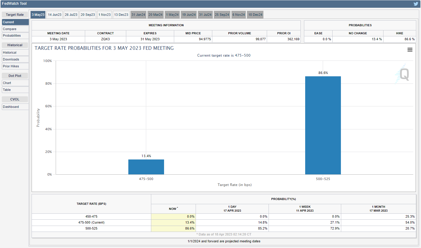 根据亚特兰大联储GDPNow模型,“4月14日对2023年第一季度实际GDP增长(经季节性调整后的年率)的估计为2.5%,高于4月10日的2.2%”,几乎没有证据表明经济衰退迫在眉睫可能会促使联邦公开市场委员会(FOMC)实施更高的利率,因为通胀仍远高于央行2%的目标。