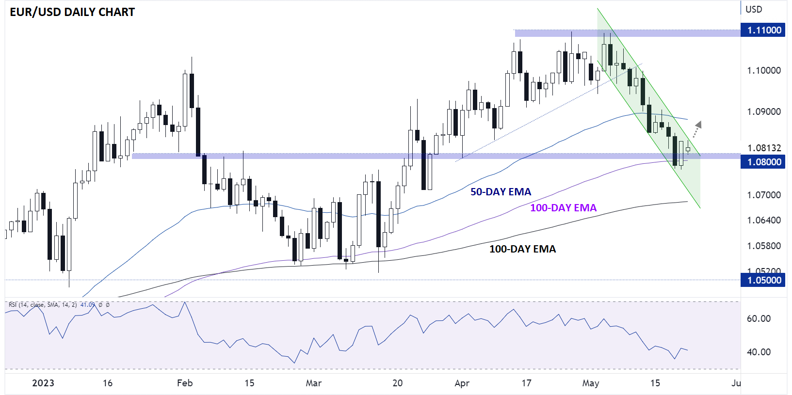 随着欧元区PMI、美联储会议纪要、核心PCE和美国债务上限谈判的进行,驱动欧元/美元和DAX指数波动的因素很多,但从纯粹的技术角度来看,交易员大概率会面临上周大幅走势以后的一些回调。