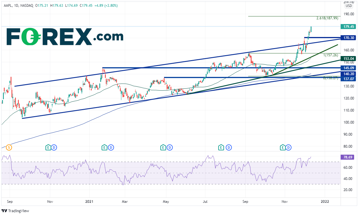 苹果公司股价上周总计五个交易日里有四个交易日创下历史新高,周五的新高在179.63。2019年以来该股不断攀高,但在2020年四季度开始加大上涨力度,有序形成上升通道,最高到达103.10。12月1日,股价跳涨至前述通道的上轨趋势线之上,只是当天收低并回到通道内。但上周五股价再度跳涨至通道上方,逼近164.29,而且这次没有回落而是持续走高。上档第一阻力位在9月8日高点到10月4日低点行情的261.8%扩展位,即188.00附近,然后是心理整数关口200.00。但请注意RSI目前处于超买状态,表明价格可能回撤。第一支撑位在12月1日以来高点170.30,然后是长期上涨通道的上轨趋势线,即165.30附近,接着是9月8日高点与10月6日以来上升通道相汇而成的支撑,即157.26附近。