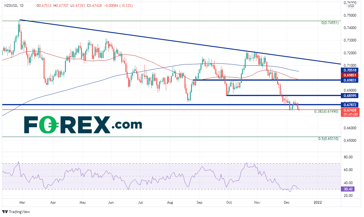 同样值得关注的是,新西兰联储本周也不召开货币政策会议。(本周主要央行中只有新西兰联储、加拿大央行和澳洲联储没有货币政策会议)。美元兑纽元周三创下年内新高,也就是说,当天纽元/美元于0.6735创下年内新低。该货币对日图看有充分的下跌空间,下个支撑位在遥远的0.6531,那是2020年3月低点到2021年2月25日高点行情的50%回档位(此文发稿时,纽元/美元落在38.2%回档位下方几点子的位置,即0.6749)。如果美元下跌,纽元/美元可望上涨。上方阻力有水平阻力位0.6860、多个水平阻力位相汇兼50天均线所在的0.6985、200天均线所在的0.7052。
