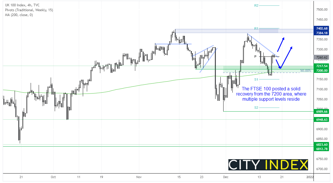 鉴于美国市场走低并回吐昨日FOMC会后全部涨幅,我们需要看看今天欧洲市场情绪风向。但若富时100指数能守在7200附近支撑区域之上(此处包括4小时图200均线、50%回档和前波段低点),我们倾向看好股指回攻7400高点。