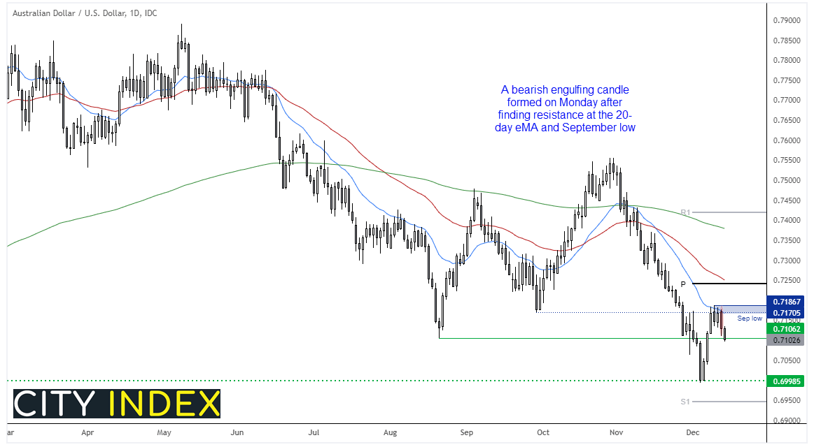 澳元/美元仍保持20天均线之下,并略低于0.7100附近8月低位。鉴于9月低点和20天均线上周连续数天作为阻力封顶,且周一构筑看跌吞没线,我们怀疑市场已经见顶。上周高点下方继续看跌,等待汇价下穿0.7100并重新测试12月低点。
