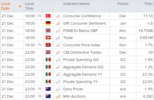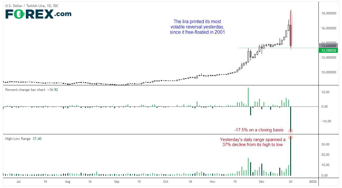 土耳其目前通胀率在21%左右,预计2022年上升至30%左右。纵然如此,土耳其总统Erdogan还是捍卫其在高通胀环境中降息的政策,于周日声称“我们正在降息,不要期待我们会做别的”。土耳其里拉在周一先是跌至历史新低,但随着Erdogan表示,土耳其政府将采取新的举措,保护居民存款免受汇率波动的冲击(只是没有说明具体的措施),里拉创下2001年自由浮动以来的最大单日涨幅。美元/土耳其里拉因此收低17.4%左右,而日内高低点区间更是高达不可思议的37.3%。