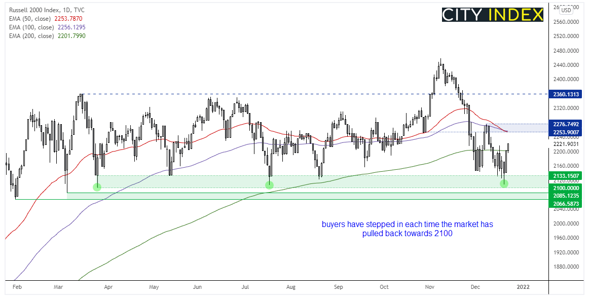 罗素2000指数是我们正在关注的一个美国市场。该小型股指数较去年11月高点下跌近15%,一路回探至3月-10月区间低点。自4月以来,买家每当市场回落至2085-2130区域时就会入场推高,本周同样如此,指数在触及2100略上方低点后再次反弹。此外,指数昨天收于200天均线上方。因此,我们在2100上方继续看涨,初始目标位在100和50天均线2250附近。若升穿2300,上看2360。