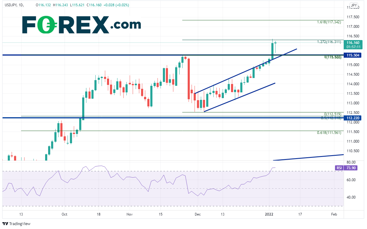 美元/日元因此收复当天失地且尝试测试昨天高点116.35,目前还差一小步。如果鹰派声音源源不断,则美元/日元后市可能上看2021年11月24日高点到2021年11月30日低点行情的161.8%扩展位,即117.34附近。