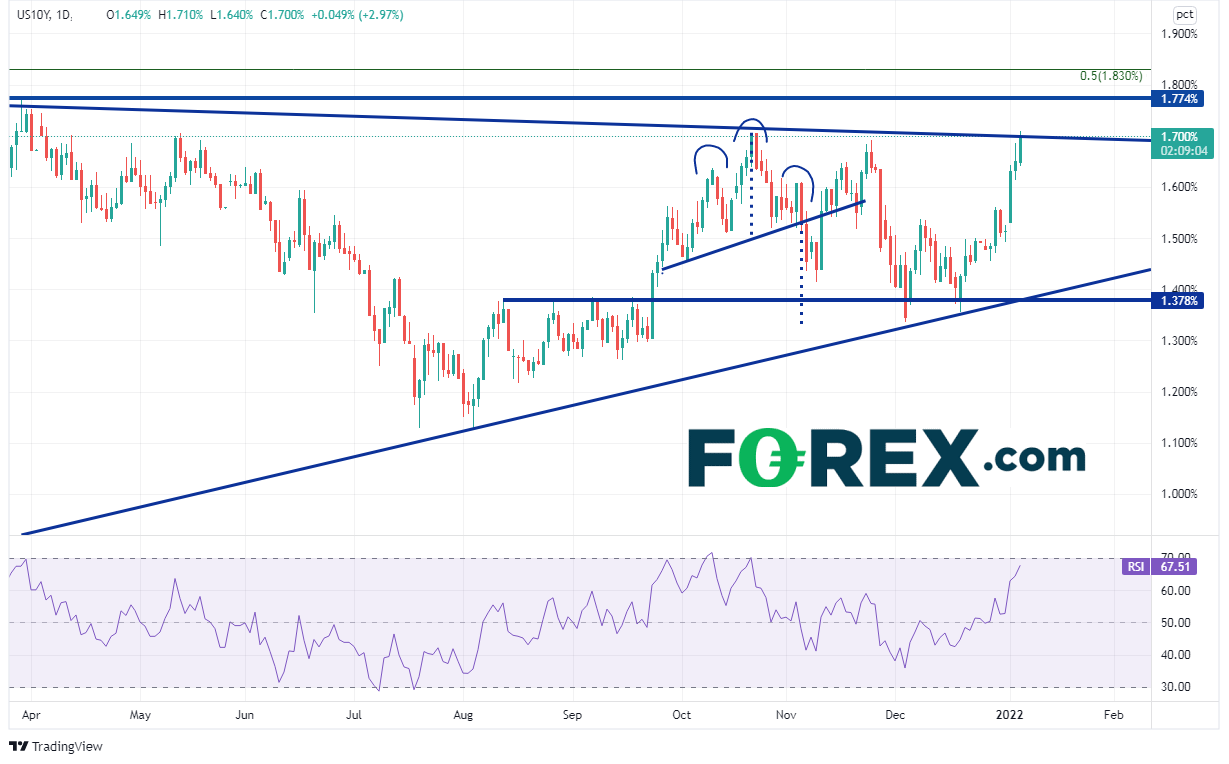 美国政府债券收益率同样冲高,最高摸至1.70上方,创下2021年4月以来新高。