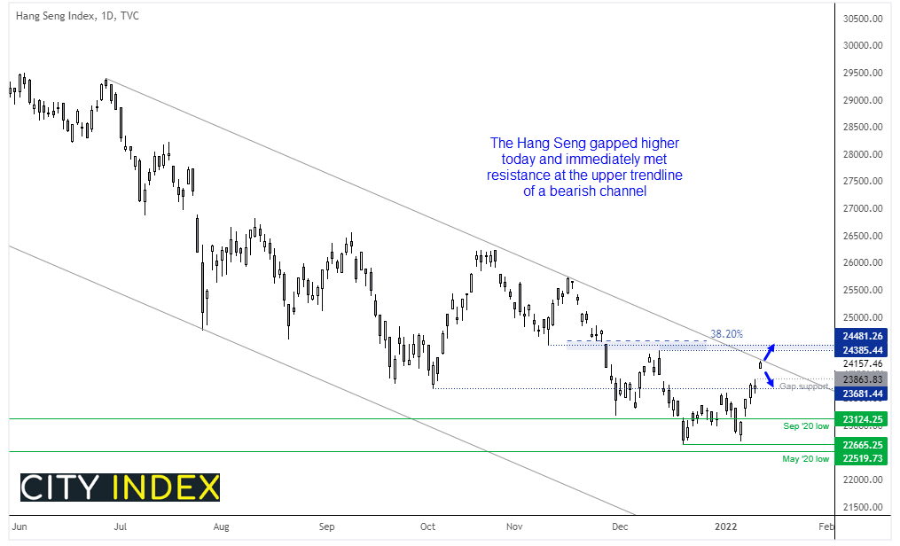 在科技股领涨的带动下,华尔街股市反弹,帮助恒指跳空攻向1个月高点并将1月低点以来的反弹扩大至6.5%。双底已于22600附近成形,大概预测上行目标在22650附近。但涨势已在一条数月看跌通道顶部趋势线24000略上方告停。纯技术面角度来看,恒指有理由自上述水平回落,尤其如果美国通胀强劲反弹并再次拖累美股。若趋势线守住,我们将等待恒指填平缺口,目标看向28863。反之,若恒指上破,多头即时目标在24385高点附近。全球股市近期情绪走向或最终决定指数将朝哪个方向突破。