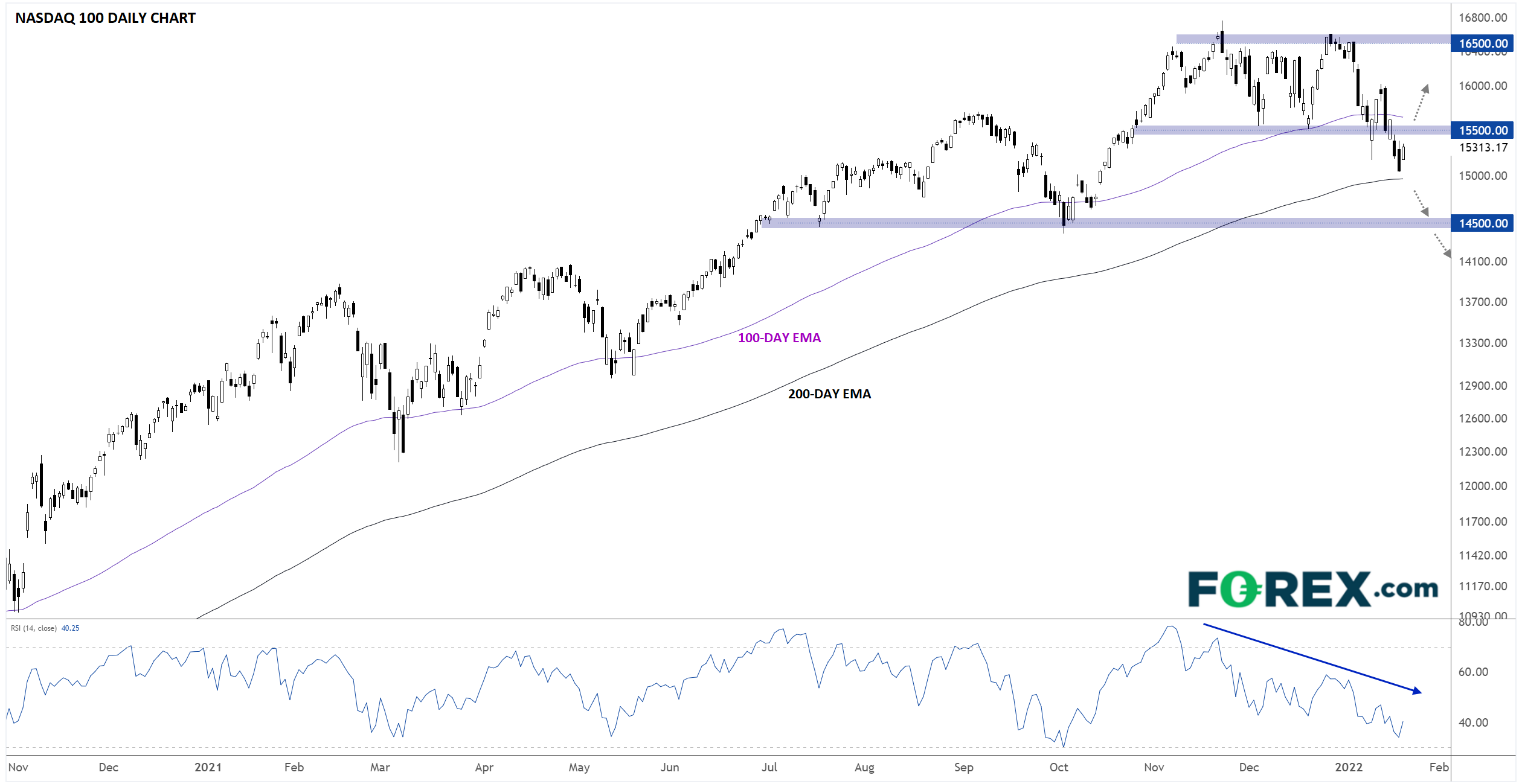 纳斯达克100指数多头对这样大步向前的行情也许慢慢习以为常、丧失了警惕,看到2022年初7%的暴跌才会大惊失色。如下图所示,这是该股指自疫情爆发以来首度确凿地下破100天指数移动均线,并且施压落在15,000附近的、备受瞩目的200天指数移动均线。