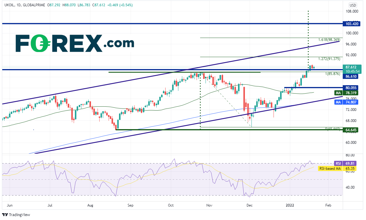 西得州原油差价合约和布伦特原油差价合约站上2021年10月高点,创下2014年10月以来最高点,前者盘中高点达到87.90,后者则为88.64。在美国通胀率高达7%、英国通胀率触及5.4%的背景下,油价逼近新的短线高点也在情理当中。另外,OPEC宣布,预计今年原油市场需求旺盛,主要原因是各经济体在疫情后陆续重启经济活动。供应端看,部分OPEC+成员国未能用尽产出配额。再加上波斯湾和俄罗斯地缘政治动荡,这些因素悉数助涨油价。