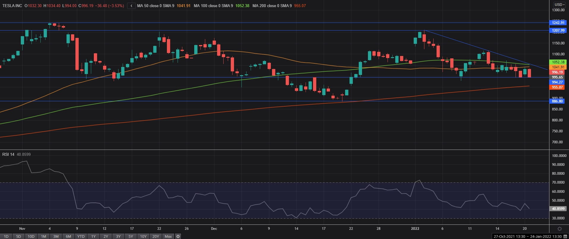 特斯拉股价自今年年初以来一直呈下跌趋势,跌幅已达19%。但在上周下穿50天和100天均线后,该股似乎已于当前995美元价位获撑。